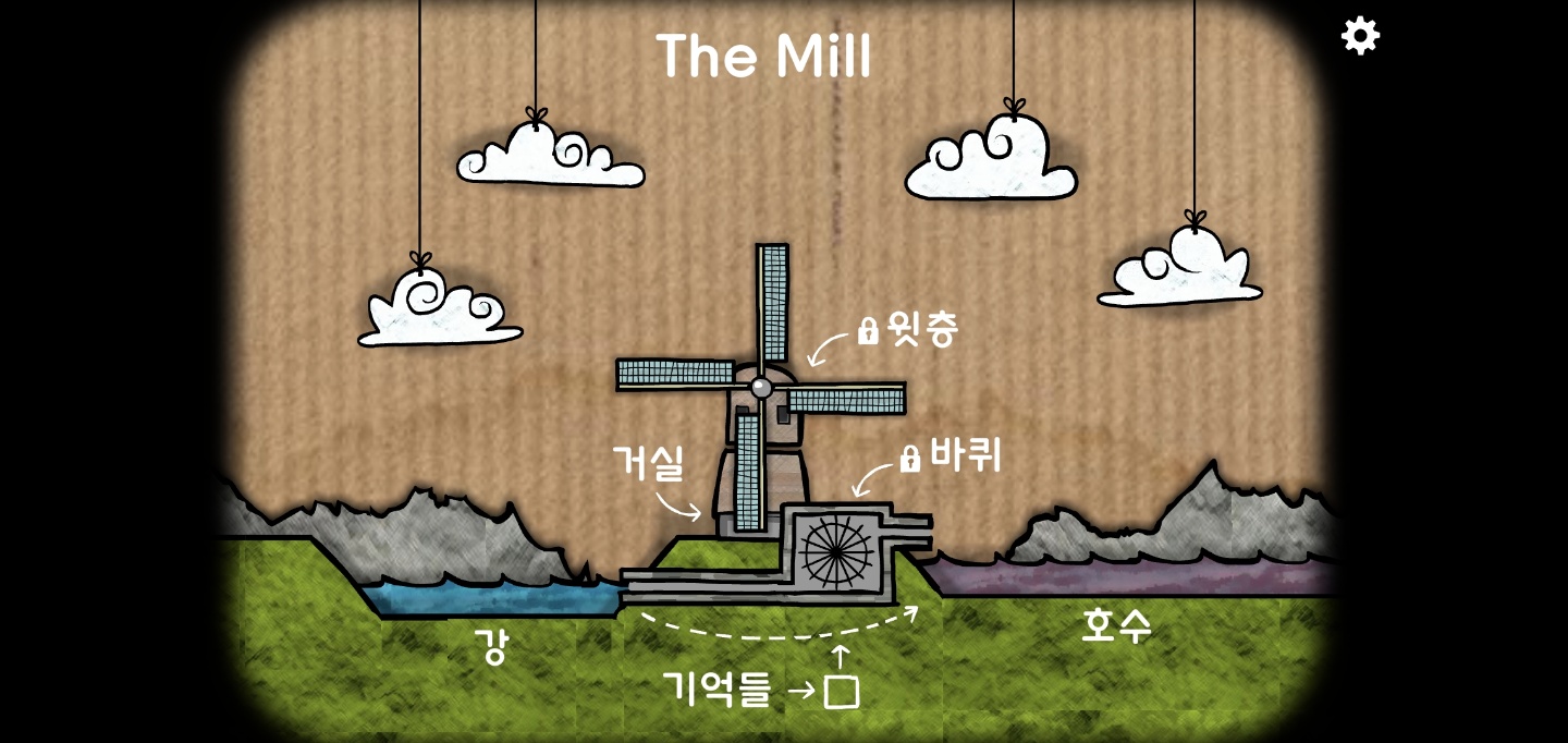 바퀴를 돌려 강에서 호수로 물이 흐르는데 기억들(큐브)을 떠내려 보냅니다.