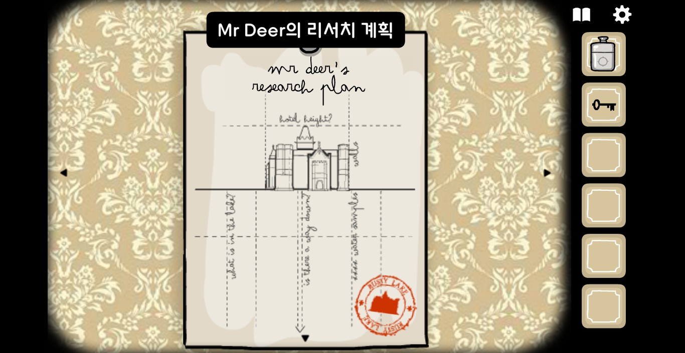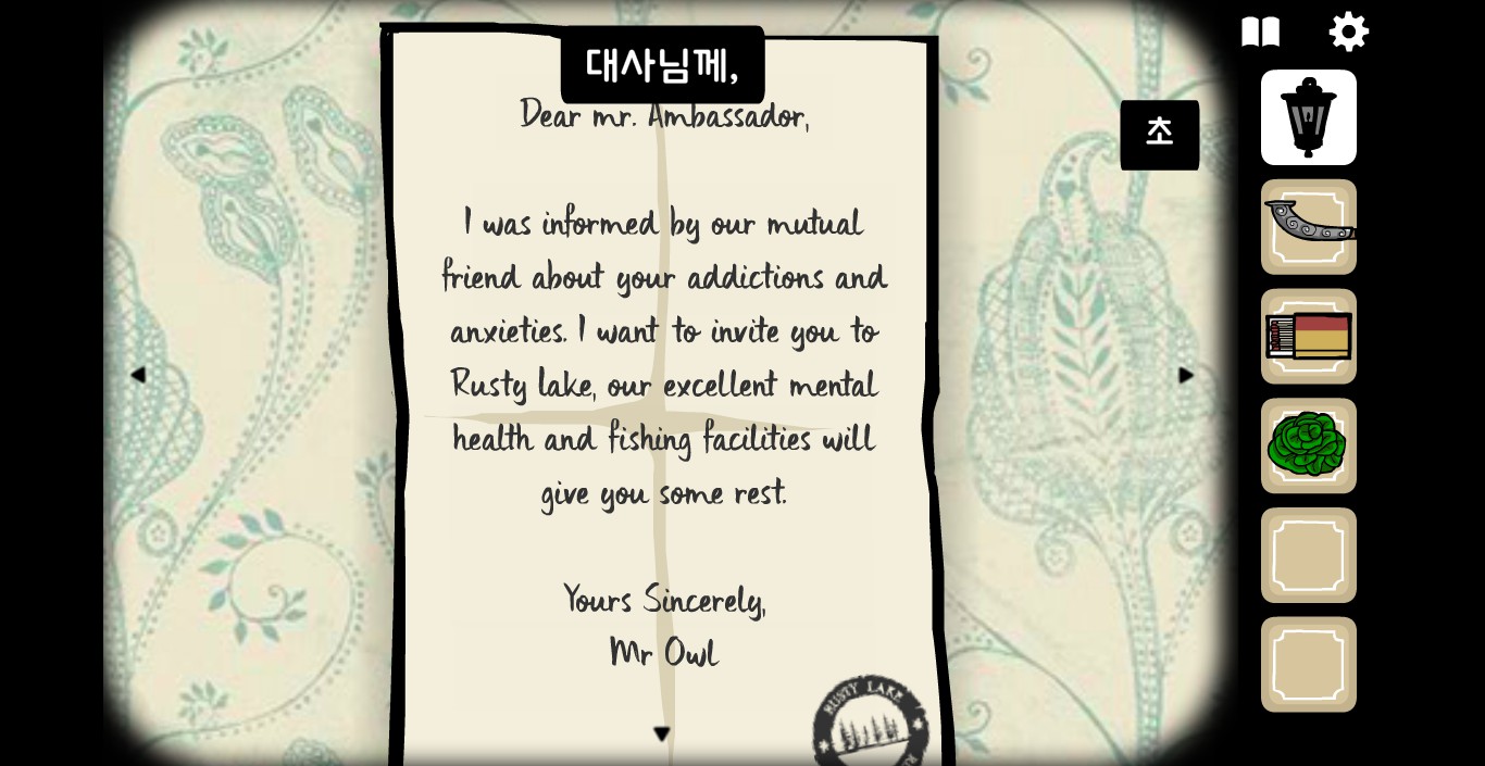 5일 동안 손님방에 있는 편지와 포스터에 있는 인장을 주의 깊게 봤으면 얻을 수 있는 아이템입니다.