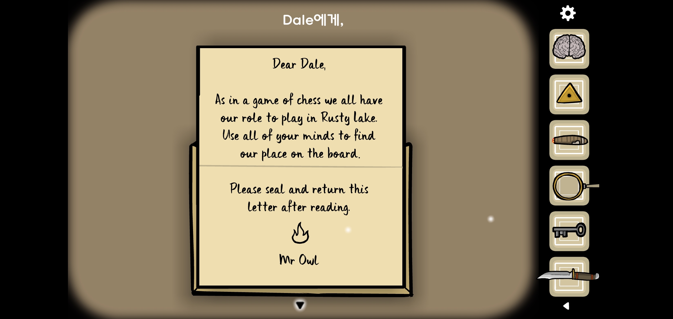 첫 번째 챕터 끝에서 데일은 호수에서 검은 큐브를 만졌고, 그는 다시 방에 갇힙니다.