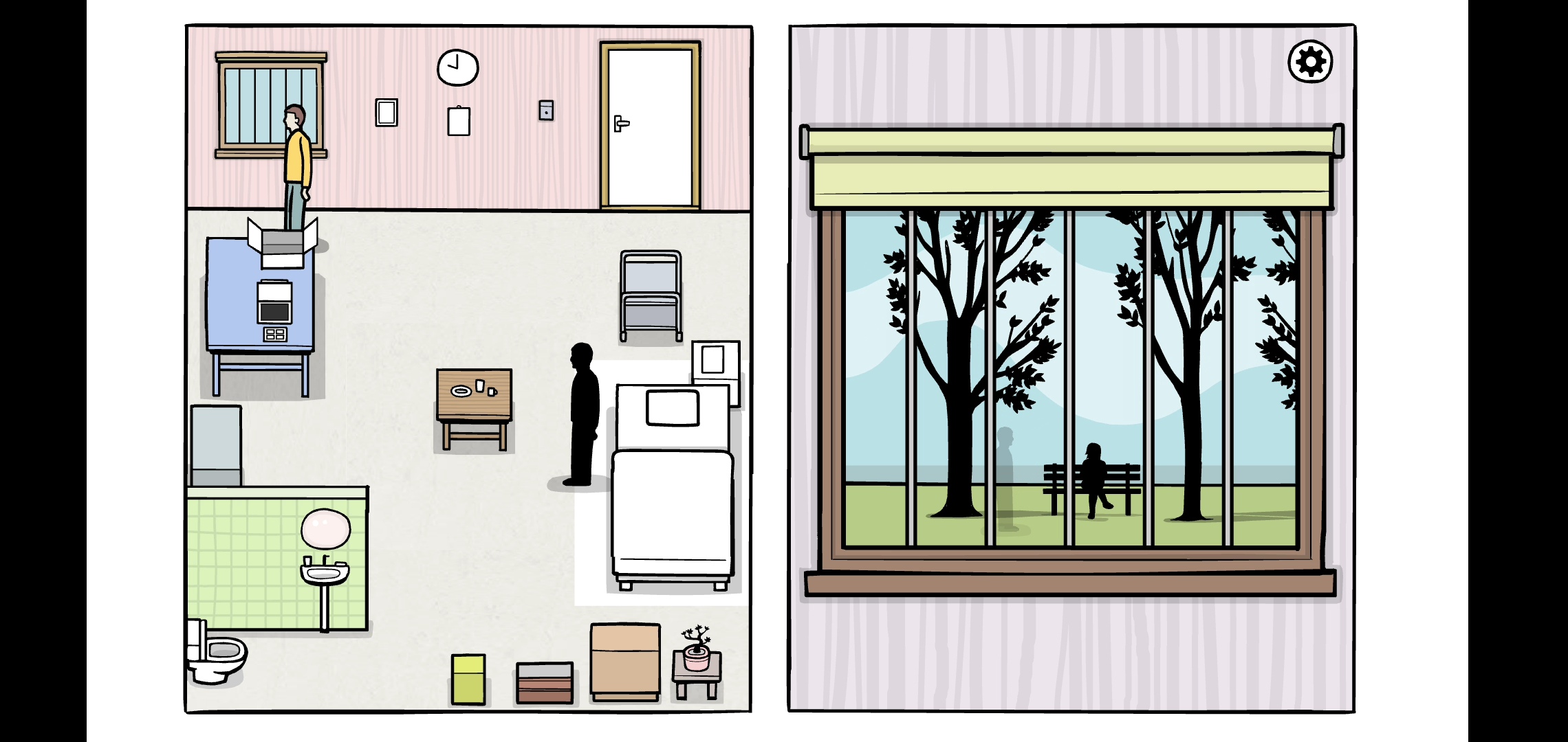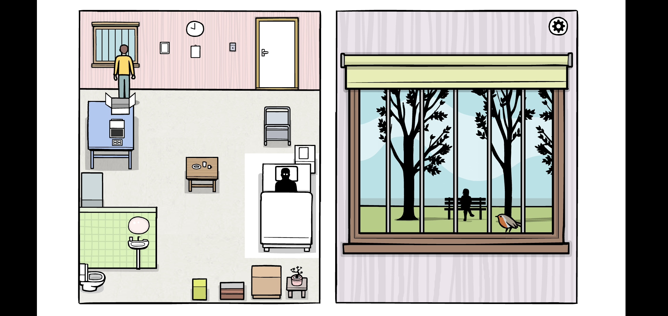 창문을 보면 새와 벤치에 앉아있는 그림자가 보입니다.