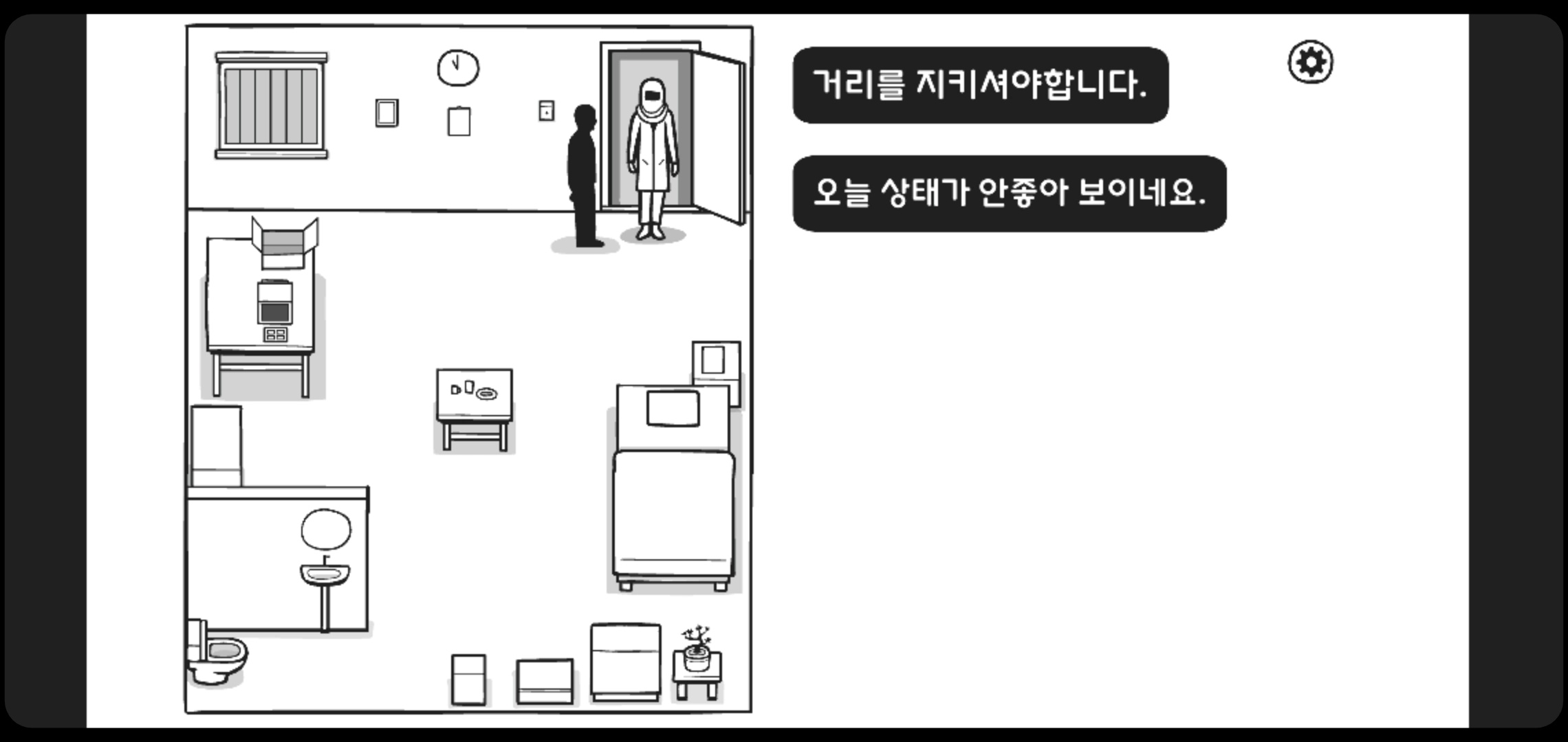 간호사: 거리를 지키셔야 합니다. 오늘 상태가 안 좋아 보이네요.