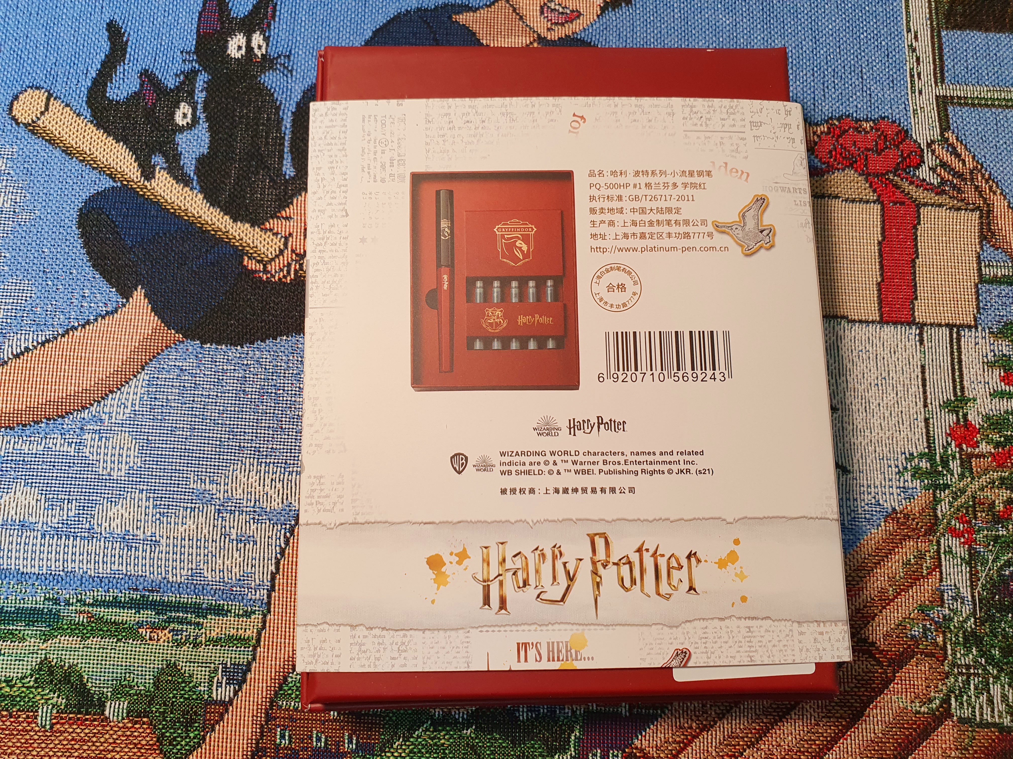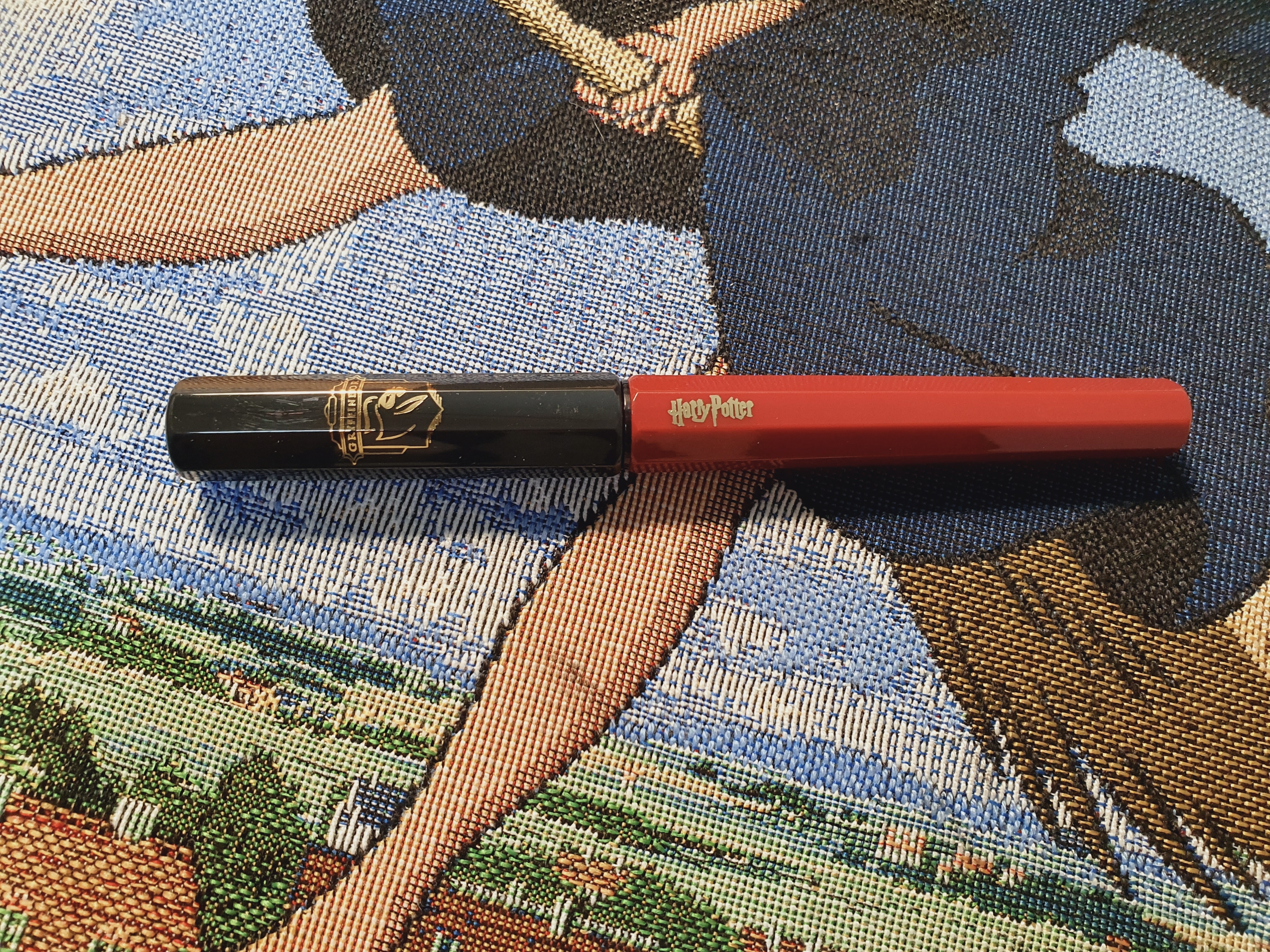 뚜껑은 검은색에 그리핀도르 사자가 있고, 펜대는 빨간색에 해리포터와 그리핀도르 문구가 있습니다.