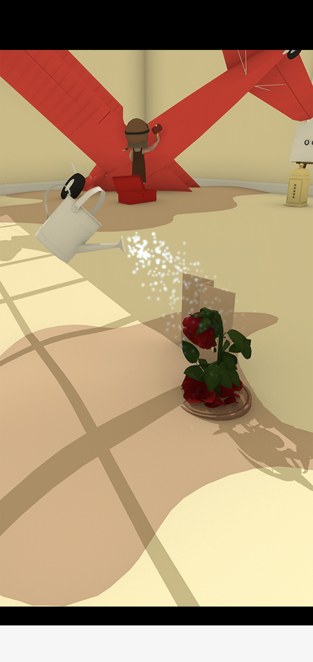 망치로 유리돔을 깨고 장미한테 물뿌리개로 물을 줍니다.