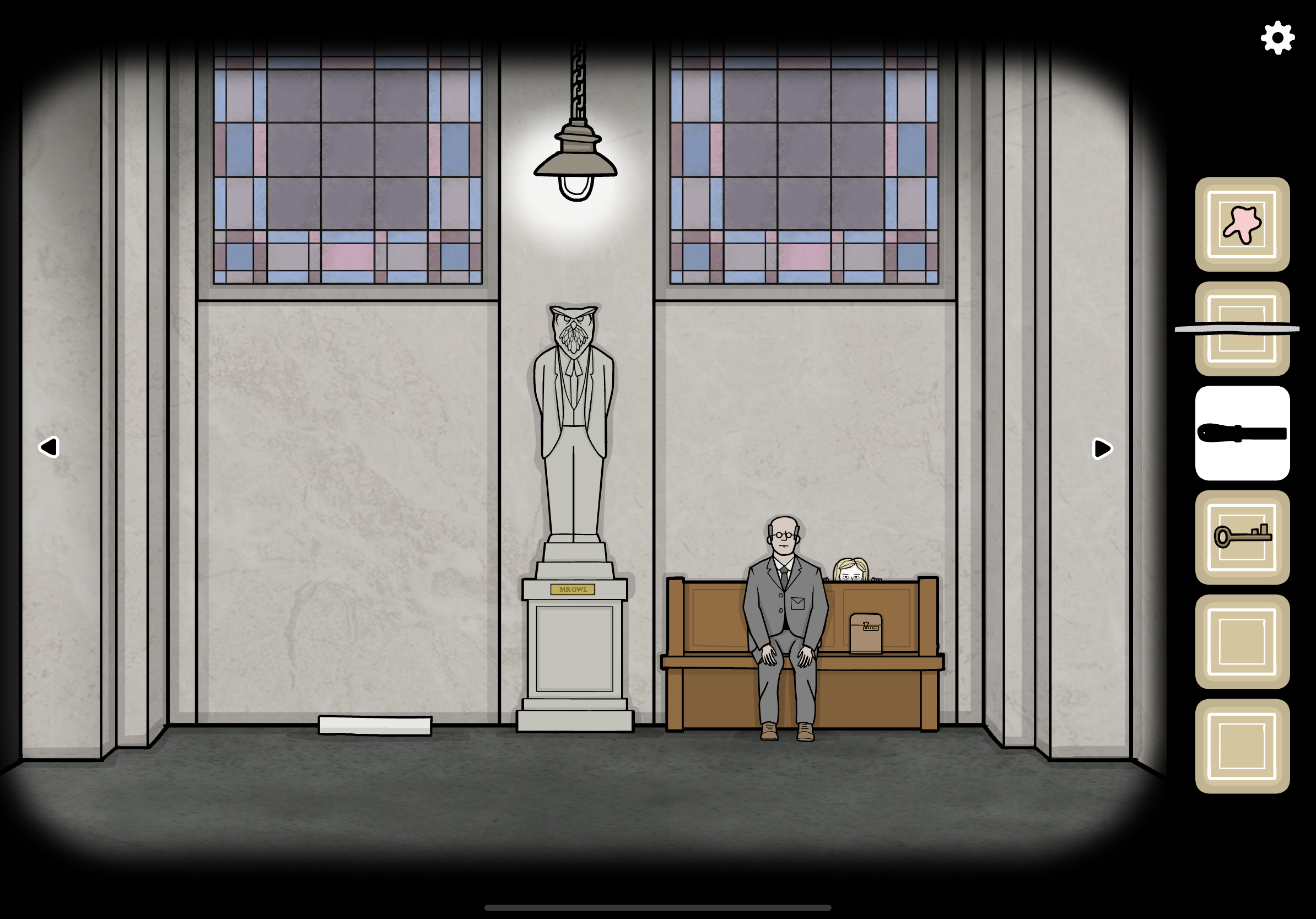 부엉이 동상 뒤에 숨은 로라를 누릅니다.