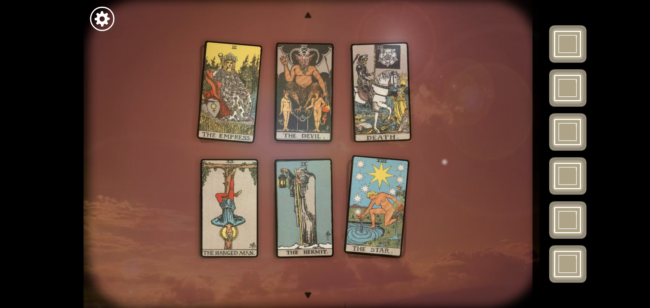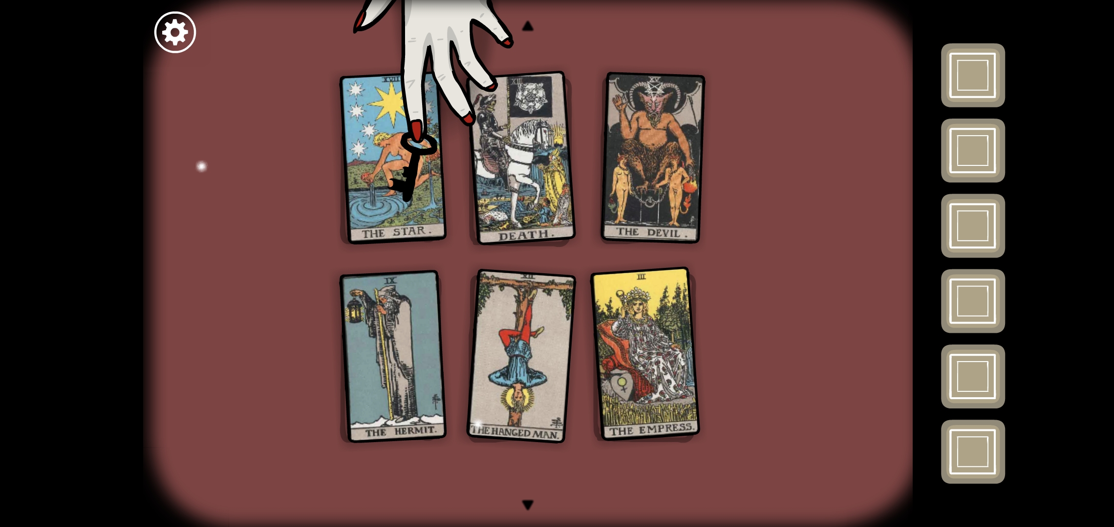 갈라진 동그라미는 은둔자, 열매는 거꾸로 매달린 사람, 역삼각형은 여왕.