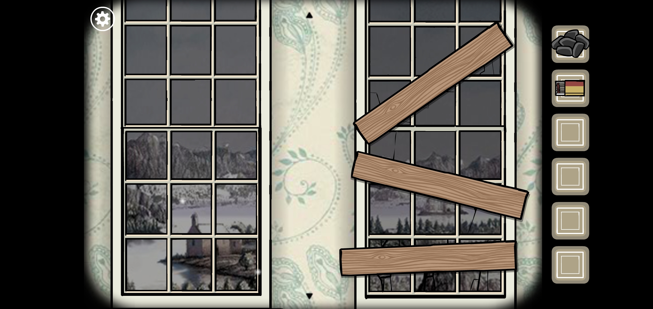 오른쪽 창문은 나무로 빈 틈을 막아줍니다.