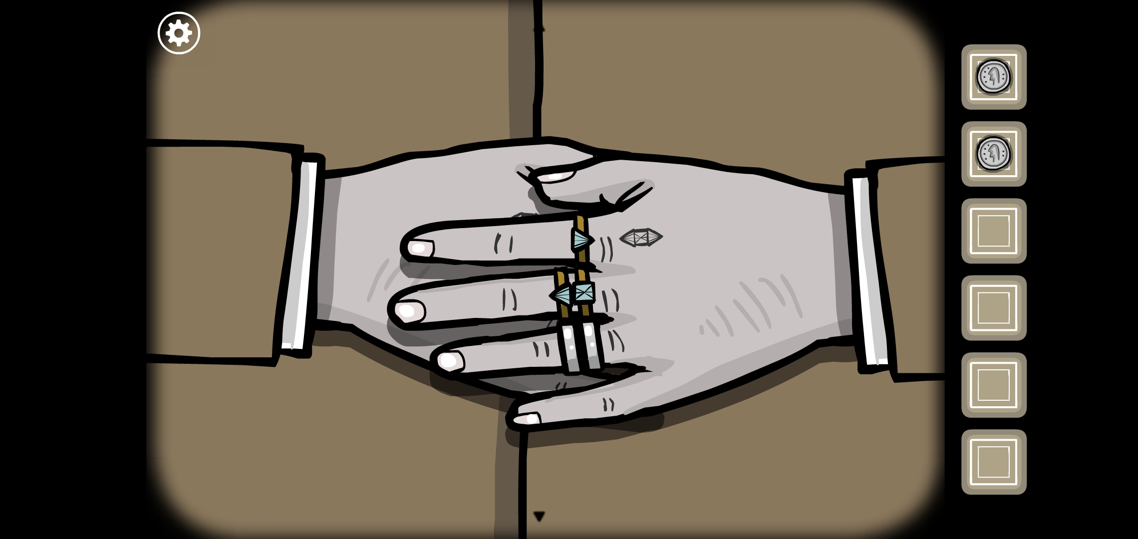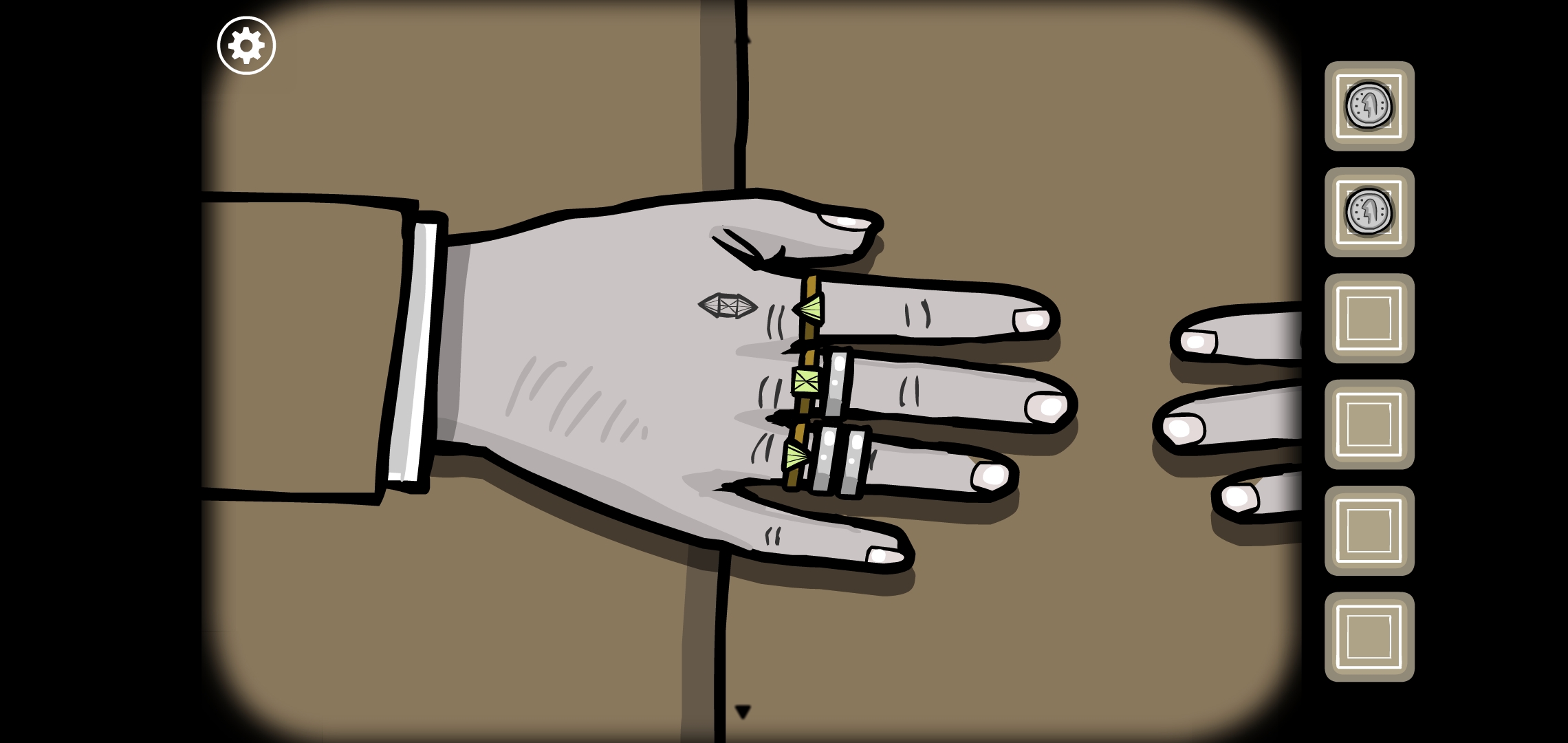 반대쪽 손의 반지 퍼즐도 풉니다.