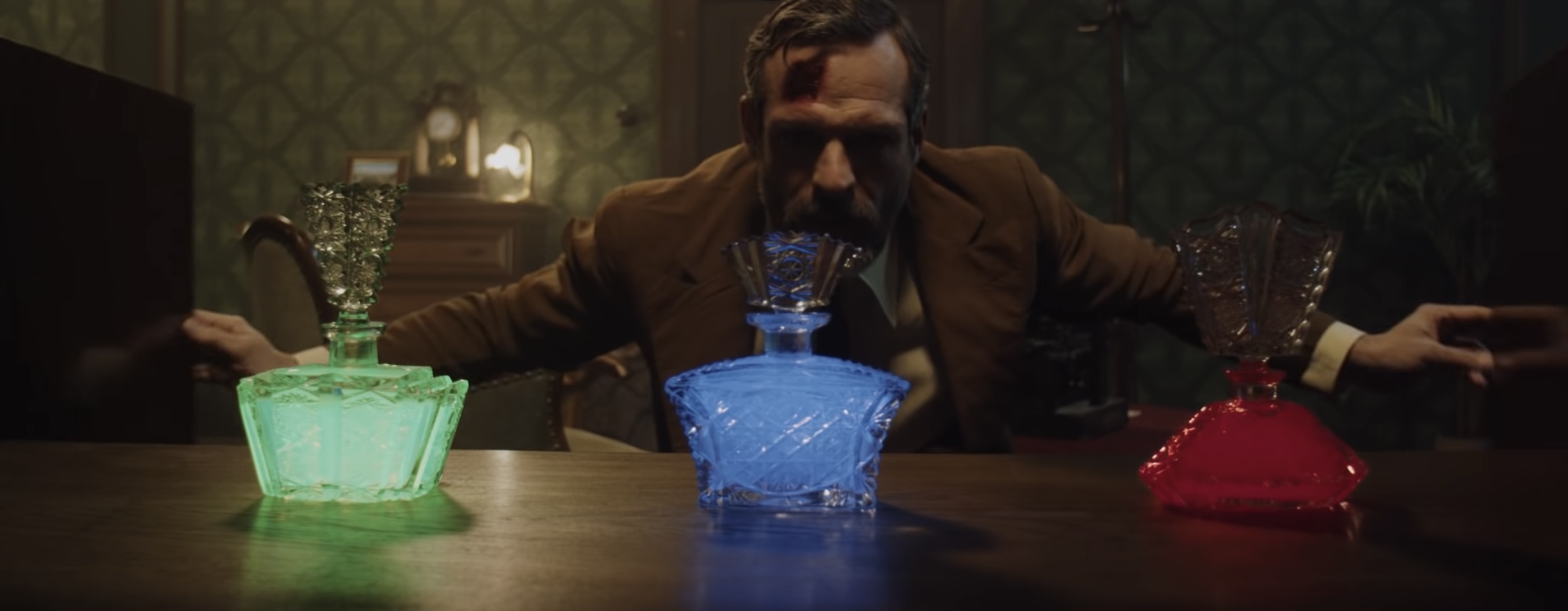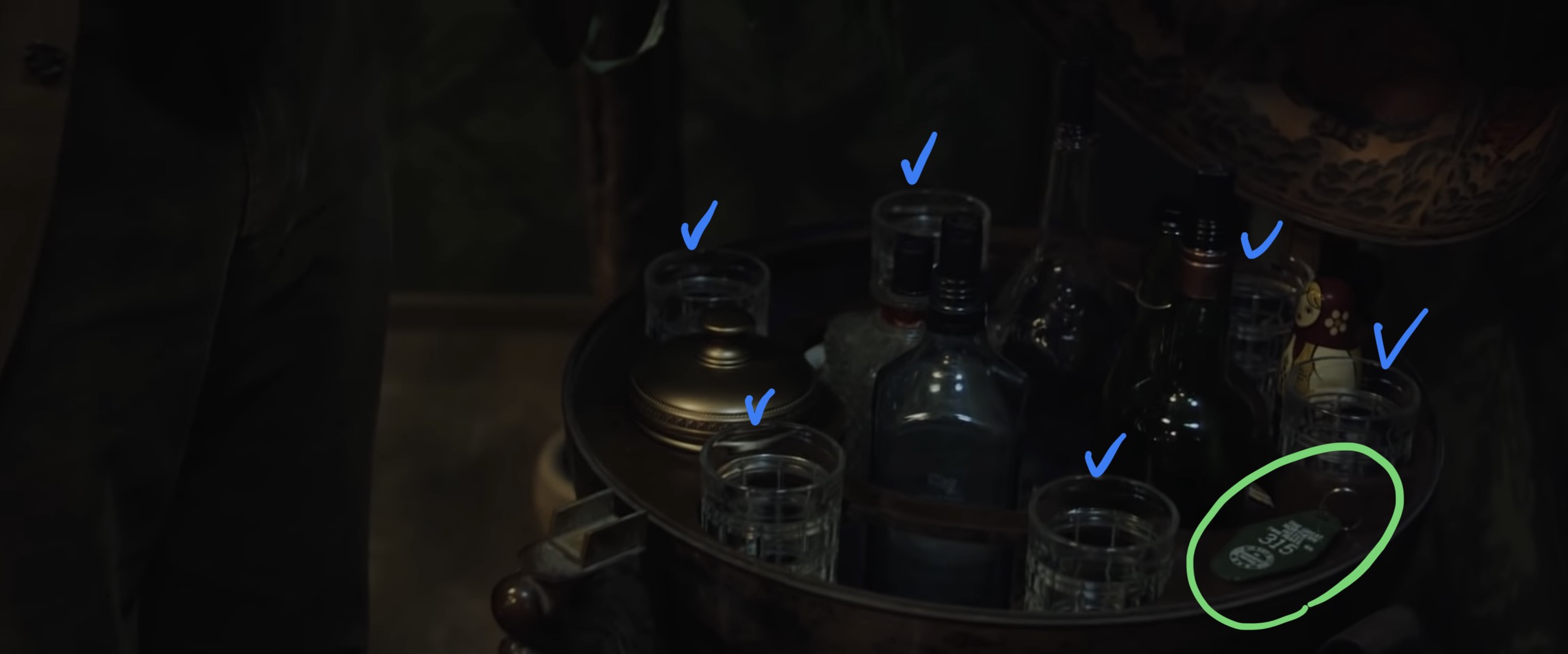 영화 속 코스터, 유리잔, 유리병의 개수를 확인합니다.