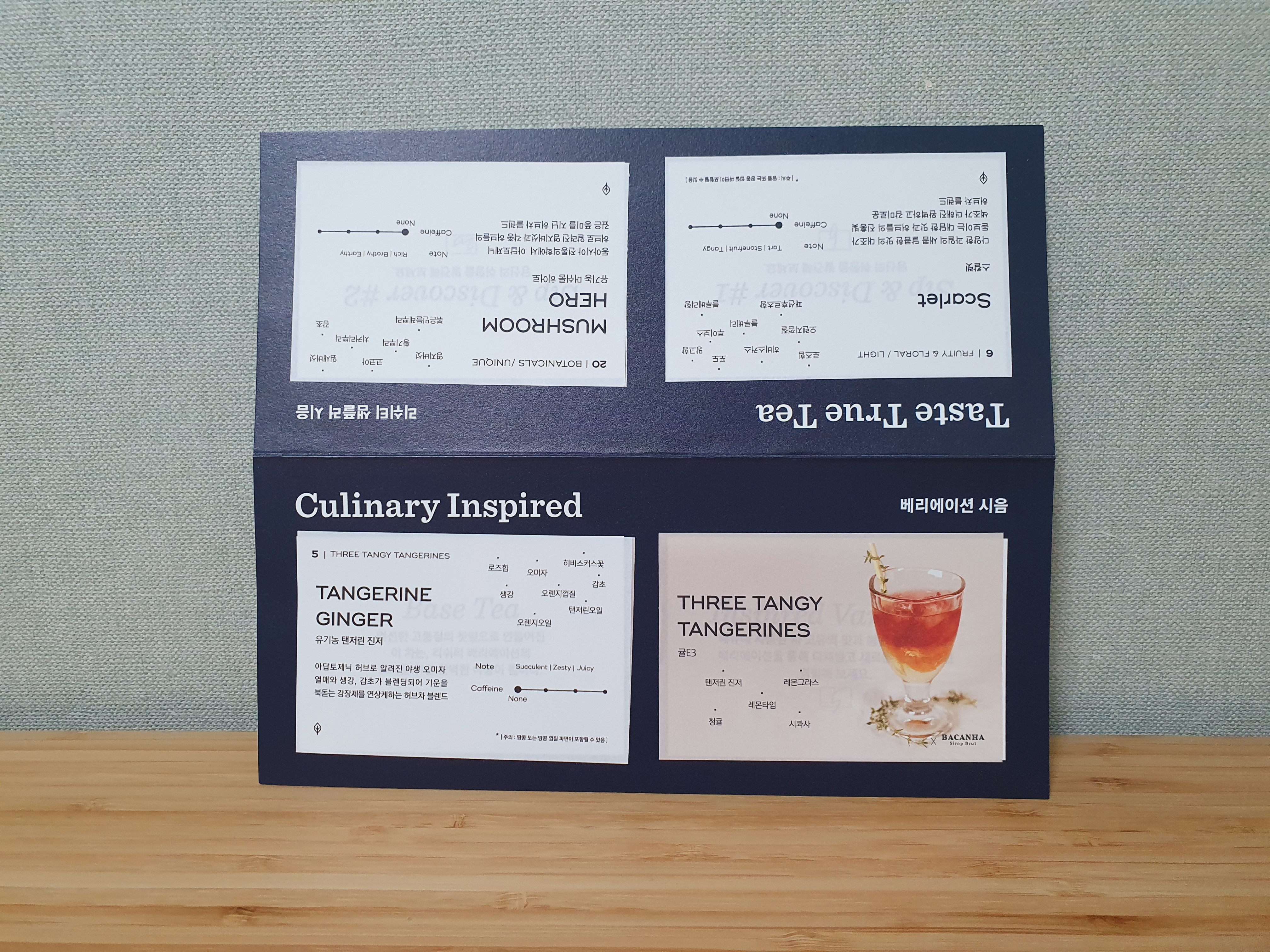 - 귤 껍질, 캐모마일, 현미, 도라지(Bellflower), 모과(Quince), 배초향(Korean Mint)