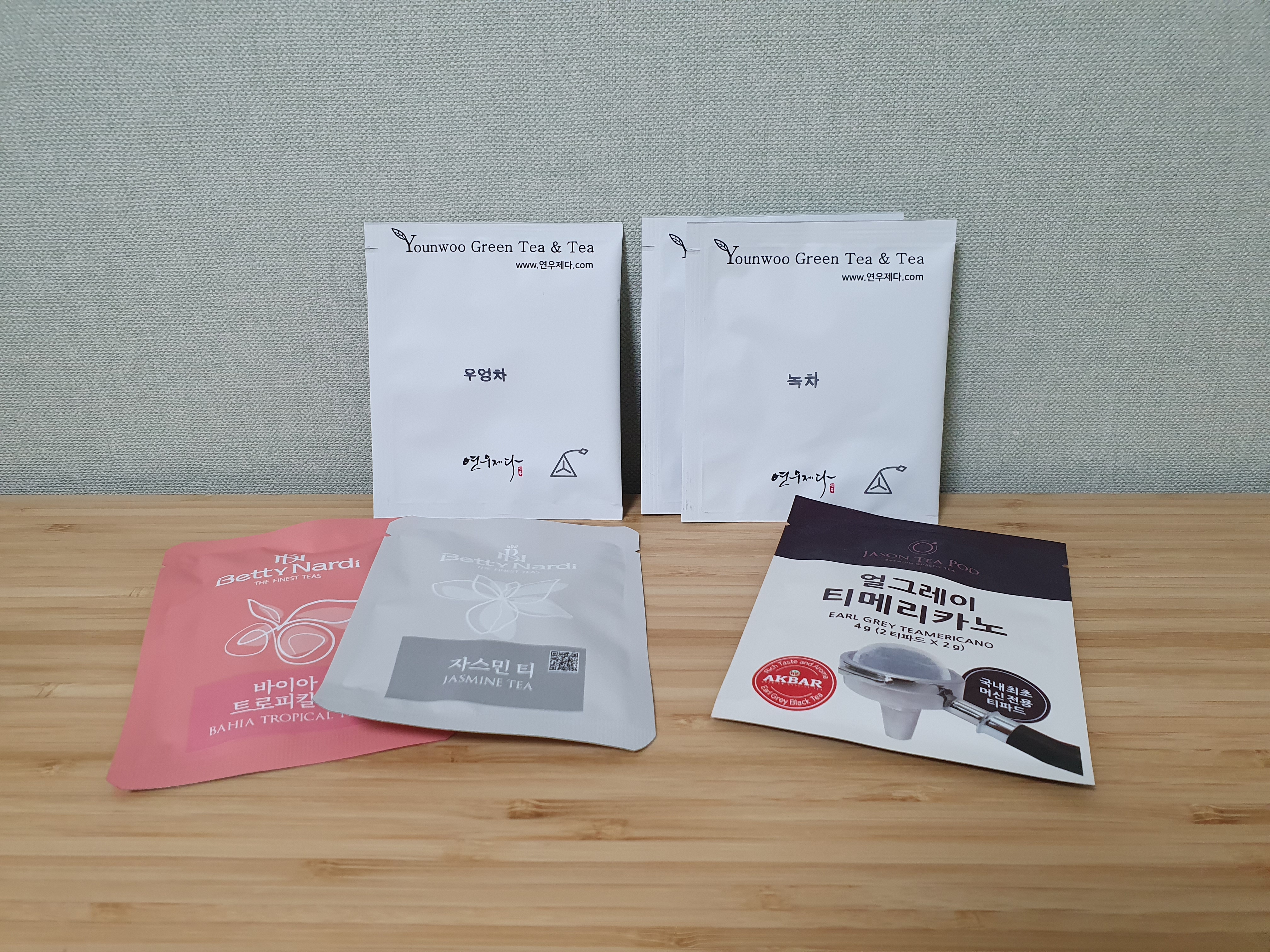 돌아다니면서 받거나 카카오톡 친구 추가를 하고 받은 티백입니다.
