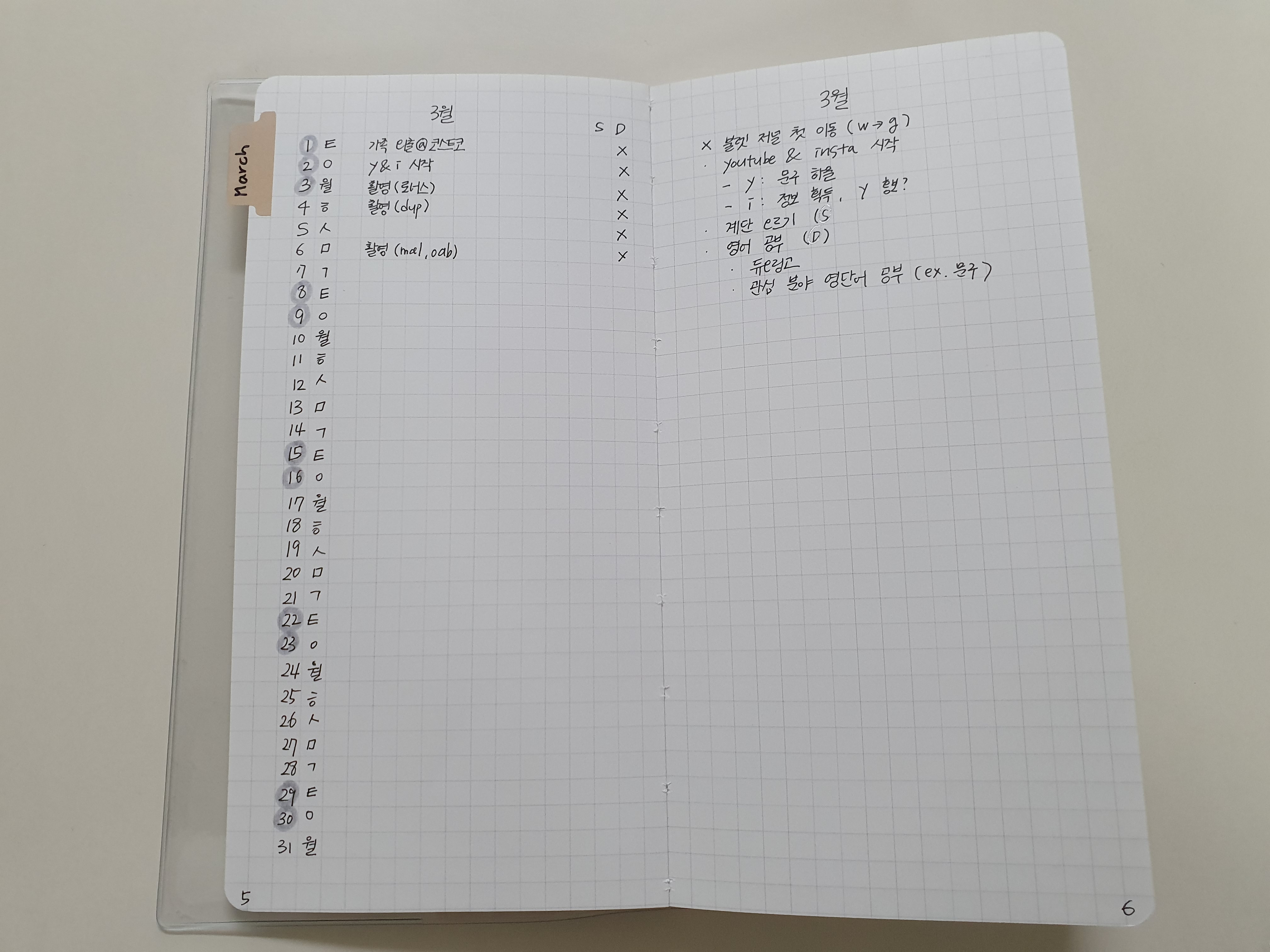 기본 사용법대로 왼쪽에는 날짜와 약속을, 오른쪽에는 3월에 할 일을 적었습니다.