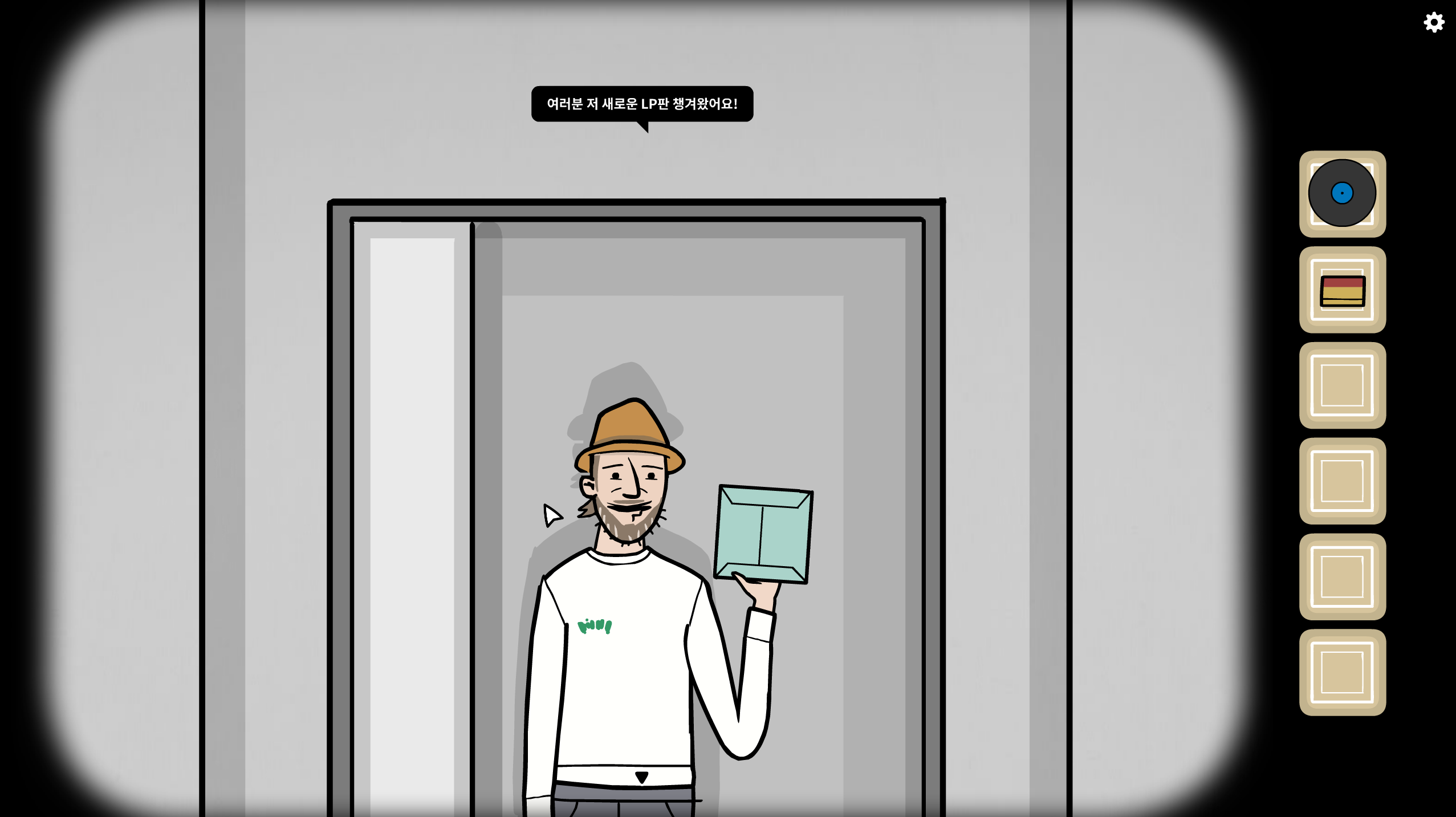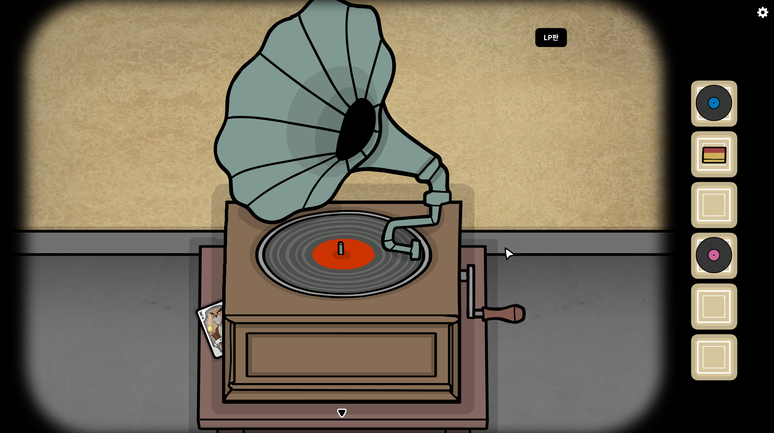 생일 파티 축하 선물로 가져온 빨간 LP를 축음기에 꽂고 손잡이를 돌립니다.