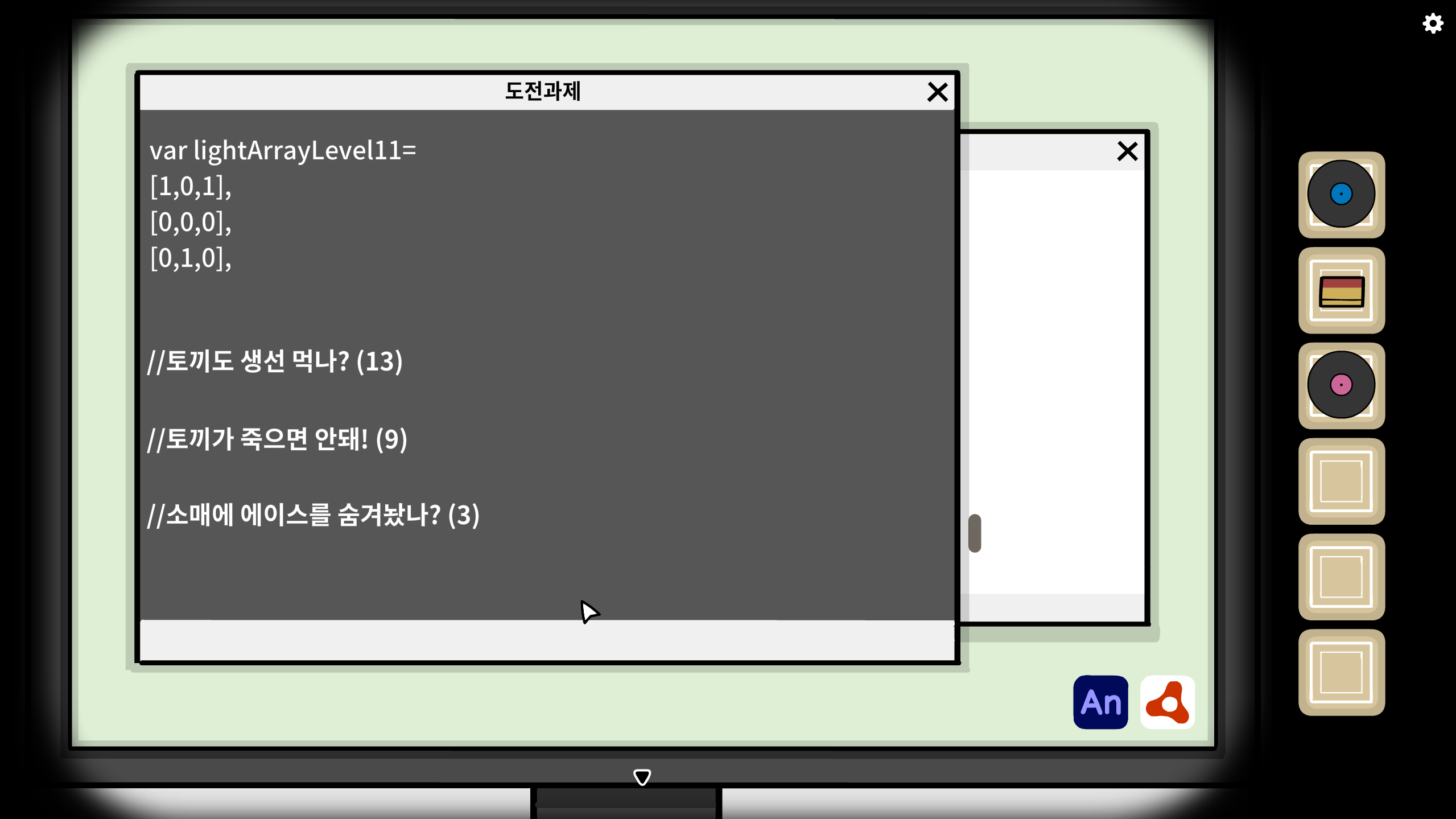 게임 11단계에서 1이라고 써진 부분만 전구 불을 켭니다.