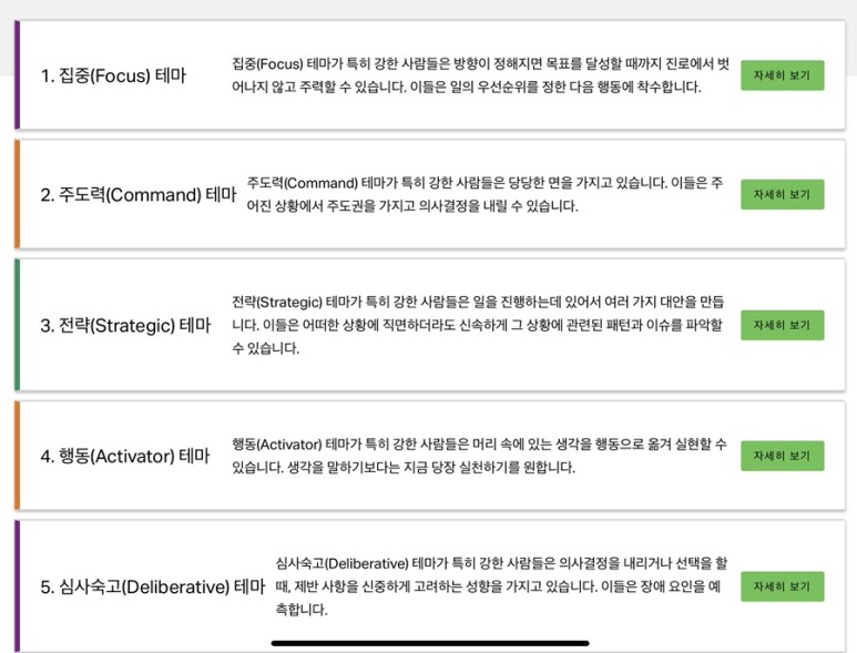 자신의 강점을 알려주는 스트렝스파인더 테스트를 했습니다.