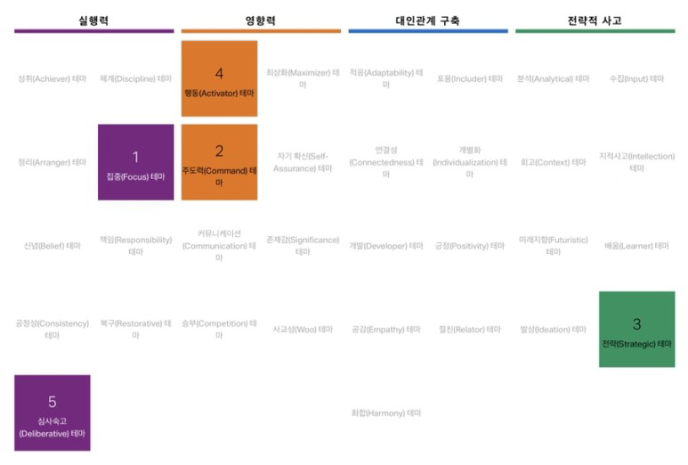 실행력, 영향력, 대인관계 구축, 전략적 사고입니다.