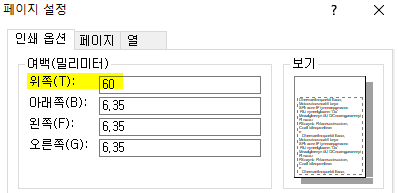 - 페이지 레이아웃 → 페이지 설정 → 위쪽 60
