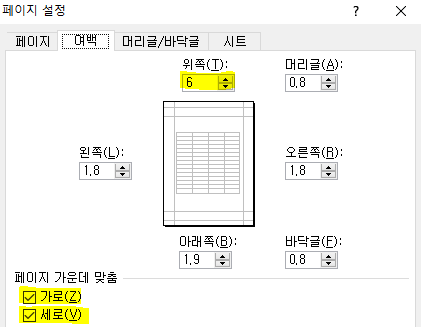 - [여백]: 위쪽 6, 페이지 가운데 맞춤 가로, 세로