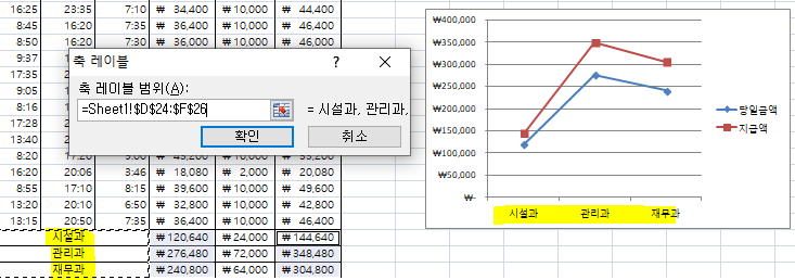 예제) 근무부서별 당일금액과 지금액의 합계를 나타내는 그래프