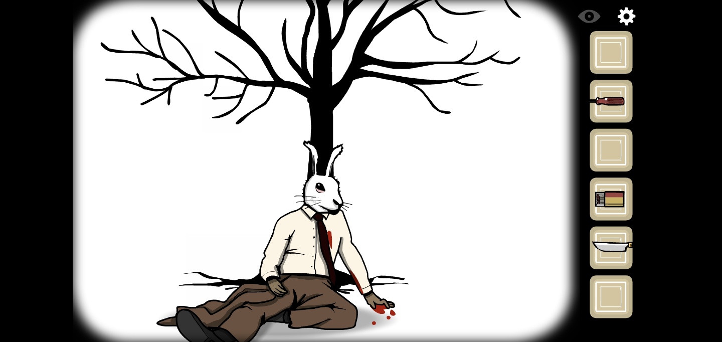 문에 남은 핏자국을 따라가면 총에 맞은 토끼가 나무에 기대 있습니다.